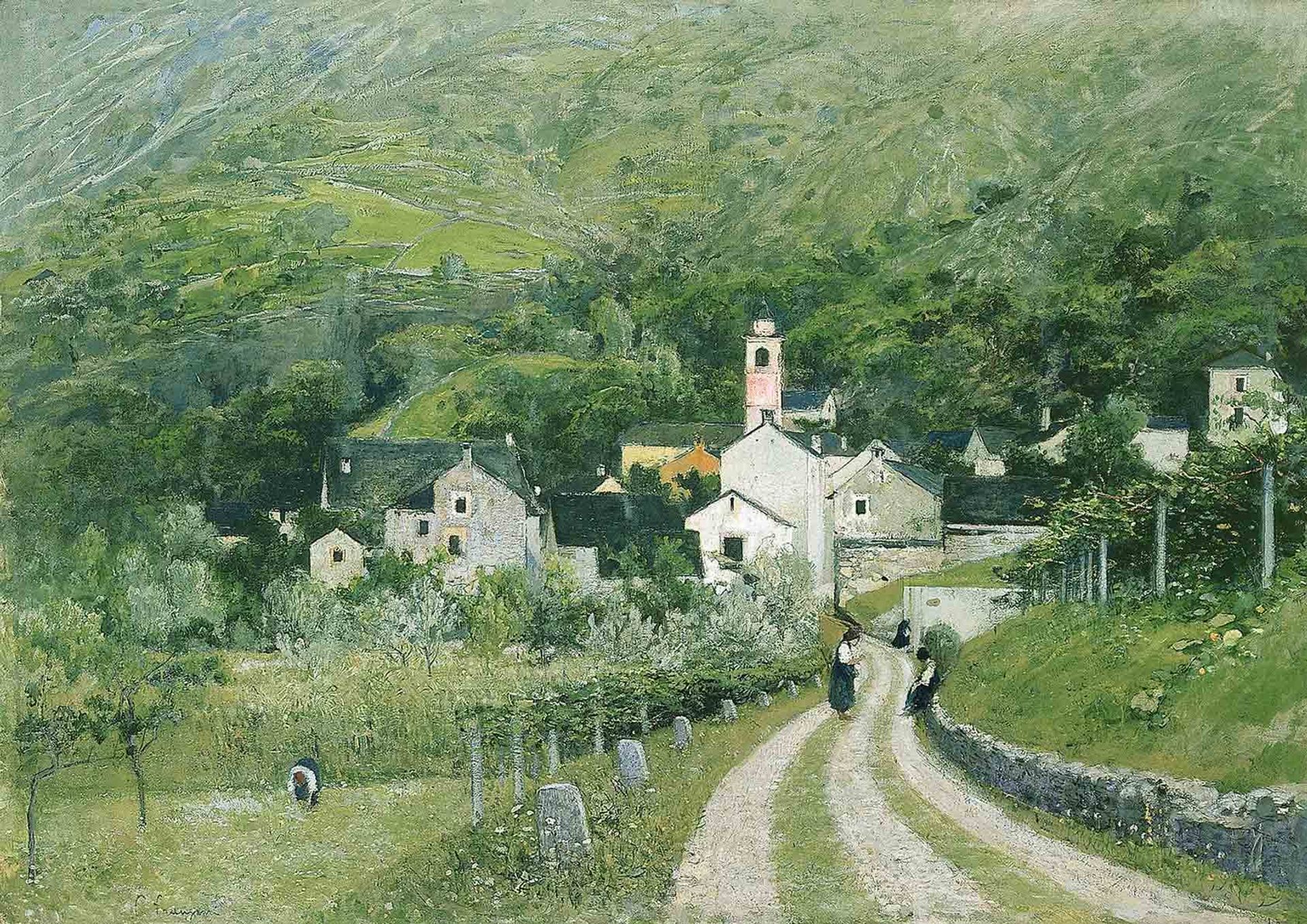 Filippo Franzoni, Lodano, Valle Maggia, a sera (Lodano, Maggiatal, am Abend), 1897 ca., Öl auf Leinwand.